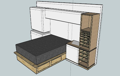This is the initial unit layout for the Wall. Like I said above I am working on the base units for now, which will house drawers. The top units will probably have shelves, but could have more drawers…The center square is the bed