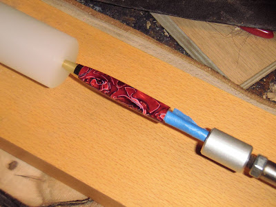 Be certain that the ferrules are held back from the ends of the blanks. This will give adequate material for squaring the blank to the cetreline of the ferrules in the next set, without shortening the over pen length. Usually, this is good place to stop for me. I set the blanks aside for the night to let the epoy achieve maximum strength.